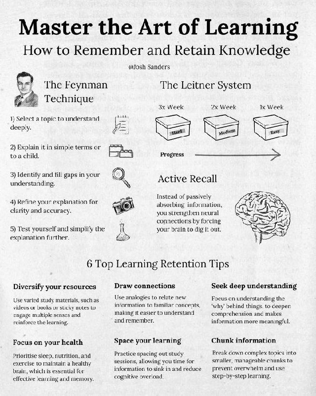 这幅图展示了如何有效记忆和保留知识的策略,助你成为学习高手: